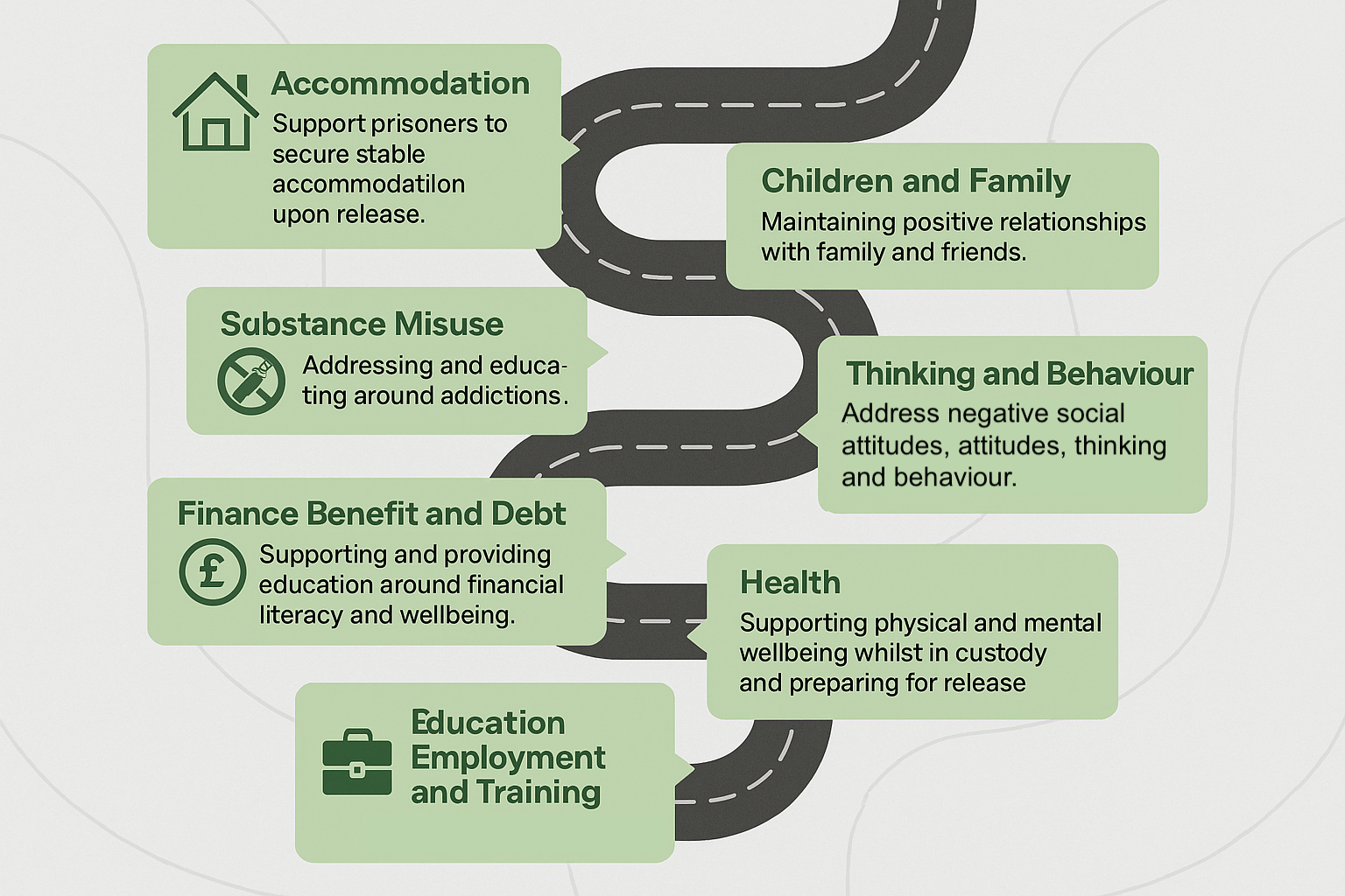 Post-release can feel overwhelming, which is why preparation and immediate access to support are essential. We adopt the 7 Pathways model alongside personal goals set by each individual to create a tailored post-release support plan before release.